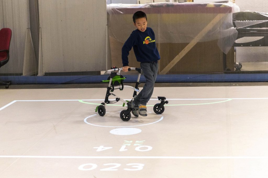 In this Nov. 17, 2019, photo provided by the University of Michigan, Bryan Kreps plays a game modeled after soccer and air hockey using the iGYM system at the university in Ann Arbor, Mich. A University of Michigan research team has created iGYM, an augmented reality system that allows people with different levels of mobility to play and exercise together. (Roger Hart/University of Michigan via AP) (Associated Press)