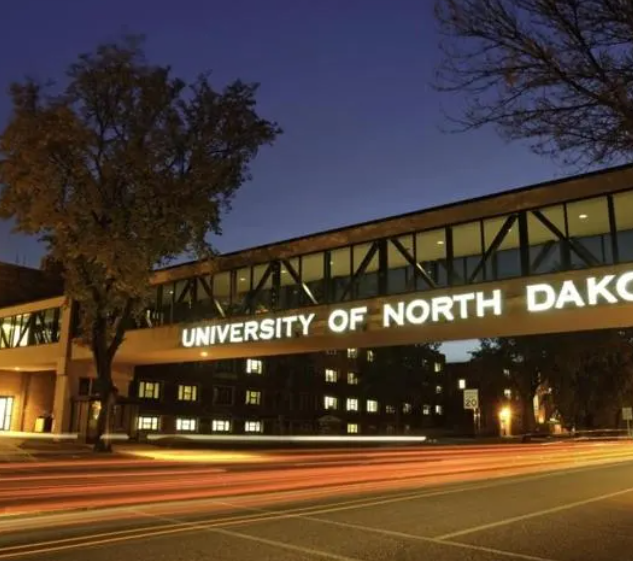 A pedestrian bridge with the University of North Dakota lighted sign across it.